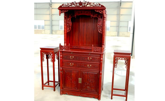 江蘇中尊木業(yè)有限公司臥室系列產(chǎn)品:佛光普照大佛龕,臥房四件套富貴大床、富貴大床床邊柜、四門衣柜等。
